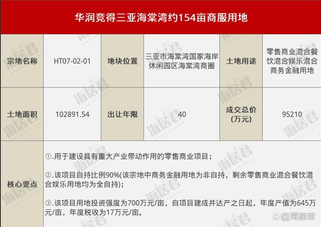 11月14日,三亚市挂牌出让一宗海棠湾商业项目用地,面积102891.54平方米(合154亩),由华润置地旗下海南润棠投资有限公司以总价9.521亿元成功竞得。该地块规划用地性质为零售商业混合餐饮混合娱乐混合商务金融用地,其中零售商业用地占47%、餐饮用地占25%、娱乐用地占18%、商务金融用地占10%,项目计划总投资45亿元,华润置地将以令人惊叹的空间与服务体验,汇集综合零售、全球美食、世界级娱乐IP、文化与艺术中心、全要素免税体验,打造一座新的全球购物度假目的地。华润置地华南大区视频号显示,三亚海棠湾项目将带来前所未见的万象新产品。这是继中国中免及太古集团之后,高端零售产业华润置地再入场海棠湾。