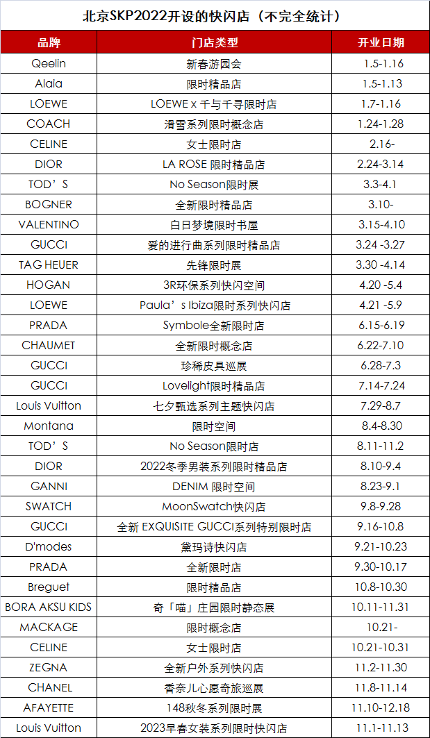据铱星云商不完全统计,截至目前,北京SKP开设34家快闪店,其中GUCCI开出4家快闪店,分别为GUCCI爱的进行曲系列限时精品店、GUCCI珍稀皮具巡展、GUCCI Lovelight限时精品店、GUCCI 全新EXQUISITE GUCCI系列特别限时店。另外,Louis Vuitton、DIOR、LOEWE、PRADA等奢侈品牌也开出2家快闪店。