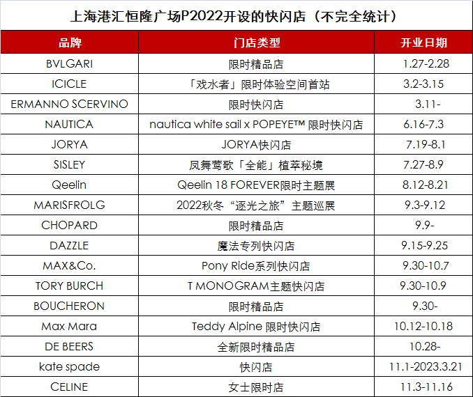 打造快闪店也是上海港汇恒隆广场提升消费者消费体验的重要方式。据铱星云商不完全统计,今年上海港汇恒隆广场已开设17家快闪店,其中不乏BVLGARI、TORY BURCH、kate spade、CELINE等国际大牌,同时ICICLE、JORYA、MARISFROLG、DAZZLE等中国品牌也表现亮眼。