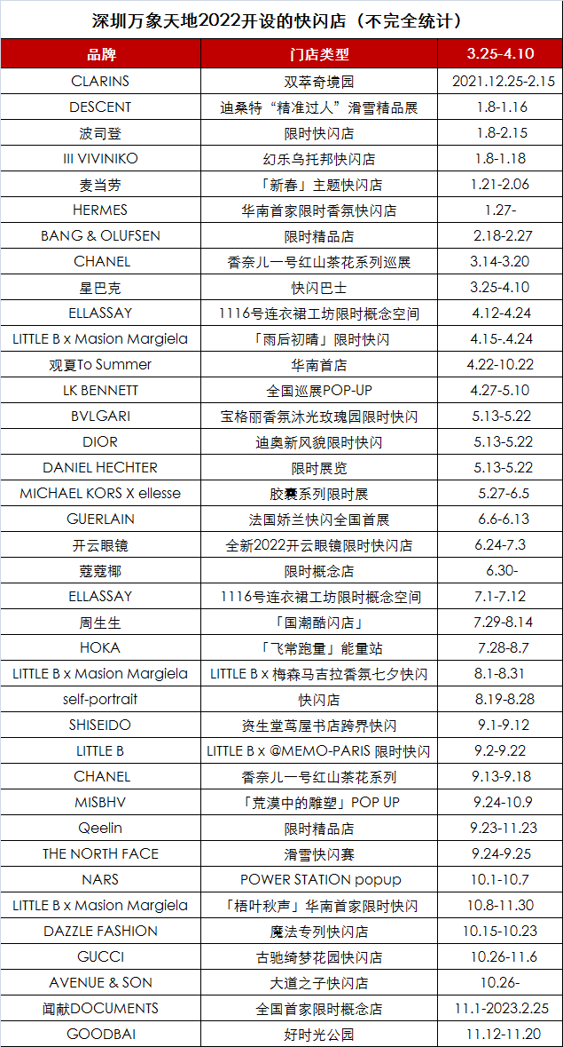 在探索潮流之路上,深圳万象天地也通过开设快闪店不断出圈。铱星云商观察到,今年深圳万象天地已打造38家快闪店,其中涵盖DIOR、GUCCI、CHANEL、HERMES等奢侈品牌;为了进一步强化项目的“潮流”标签,深圳万象天地还引进MISBHV、AVENUE&SON、GOODBAI等潮牌快闪店,及麦当劳、星巴克、蔻蔻椰等深受年轻人喜爱的快闪空间。