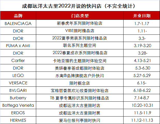 据铱星云商不完全统计,成都远洋太古里2022年已开设14家快闪店,其中有4家为DIOR品牌所打造,包含DIOR VIBE限时精品店、DIOR 2022夏季男装系列限时精品店、DIOR 2022春夏成衣系列限时精品店、DIOR美妍奢享荟成都限时体验店。此外,还有BALENCIAGA、VERSACE、Burberry、Bottega Veneta、HERMES等奢侈品牌也带来快闪空间。