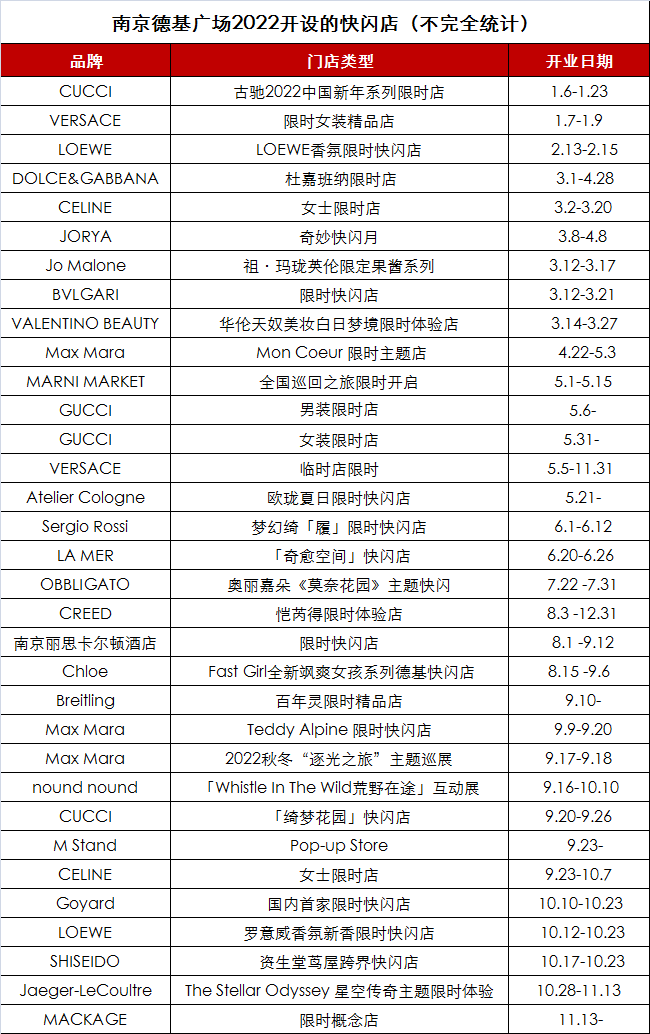 在南京德基广场开设的33家快闪店中,其中有4家CUCCI限时店,即CUCCI2022中国新年系列限时店、男装限时店、女装限时店、「绮梦花园」快闪店,5月份开设的男装限时店与女装限时店或许与场内的GUCCI闭店重装有关。Max Mara在德基广场打造了Mon Coeur 限时主题店、Teddy Alpine 限时快闪店、2022秋冬“逐光之旅”主题巡展等。