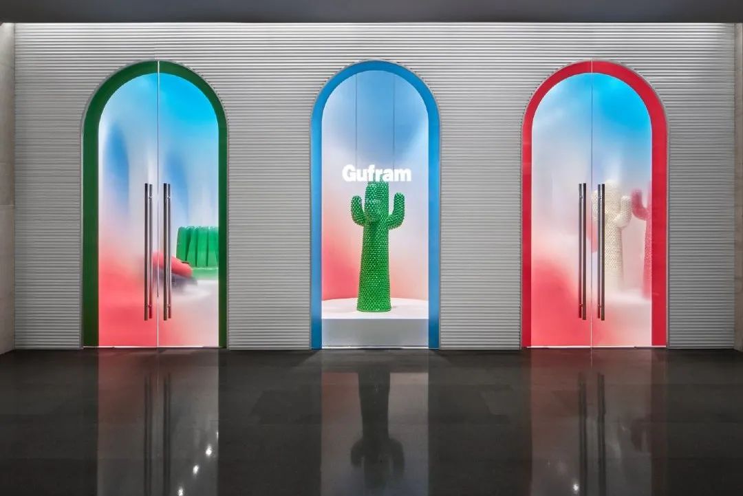 Gufram Gallery外观应用了意大利门廊广场式的设计元素,店内使用明亮的色彩、不同材质的墙面和地面,来改变空间环境及功能。该店每三个月就会更换一次门店的内部装饰和展出作品,首次展出的有形似草丛的躺椅PRATONE、仙人掌外观的Cactus衣帽架、BOCCA红唇沙发等品牌代表作。