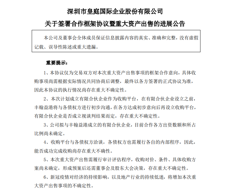 值得注意的是,本次交易目前还有多个“未确定”:一是,有限合伙企业的出资和股权比例尚未确定;二是,清偿债权金额、对价尚未确定;三是,债权置换股权方案尚未确定。皇庭国际表示,本协议仅为交易双方对本次重大资产出售事项的框架合作意向,具体收购事项尚需根据实际情况共同协商后调整,最终以各方签署的正式协议为准,因此本协议的执行情况尚存在重大不确定性。
