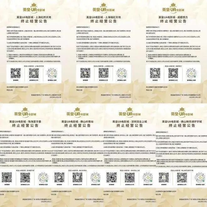 11月21日,英皇文化产业发布公告称,英皇UA决定终止全资附属营运公司英皇娱艺影院(广东)有限公司的全部业务运营,提前解散英皇娱艺影院(广东)并根据中国法律自愿向中国法院提交破产清算申请。据企查查显示,英皇娱艺影院(广东)有限公司是英皇娱艺在大陆的分公司,运营内地7家影院,分别位于上海、深圳、成都、佛山、珠海。受此影响,内地7家英皇UA电影城也于21日晚间同时发布了自11月22日起终止运营的公告。此次闭店后,英皇集团剩余17间英皇电影城和英皇戏院,其中内地有8间,香港有7间,澳门和马来西亚各有1间。