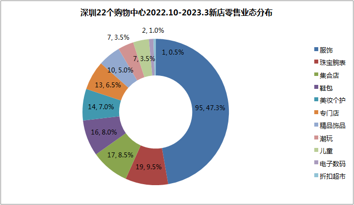 在零售大类201家新店当中,包括:服饰95家,占比47.3%;珠宝腕表19家,占比9.5%;各类零售集合店17家,占8.5%;鞋包16家,占8%;美妆个护14家,占比7%;品类专门店13个,占6.5%;精品饰品10家;占5%;潮玩和儿童零售各7家,均占3.5%;电子数码2家,仅占1%;最后是1家折扣超市,占比0.5%。