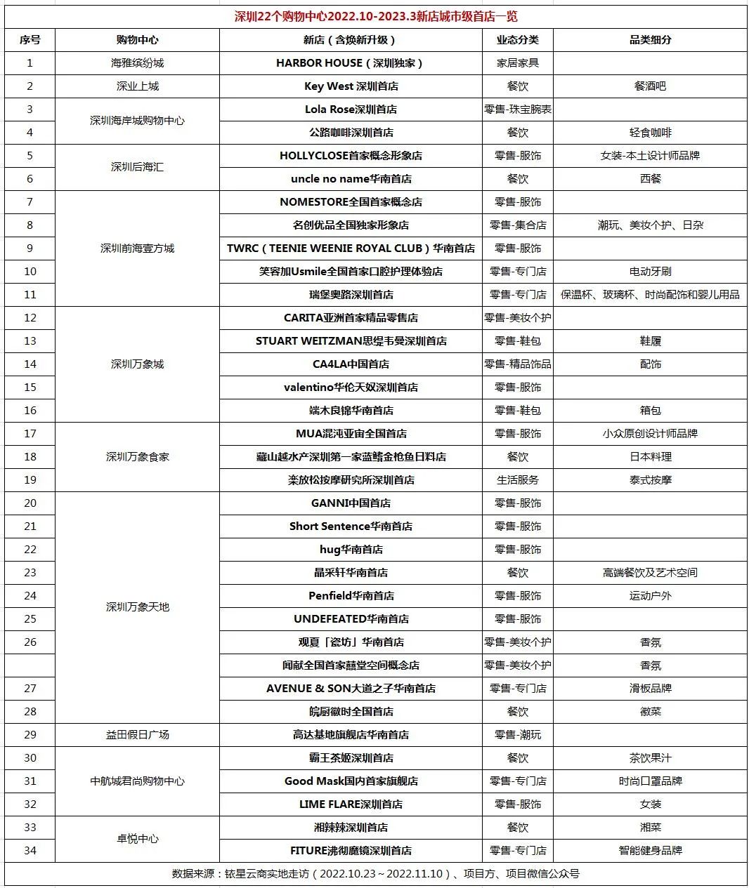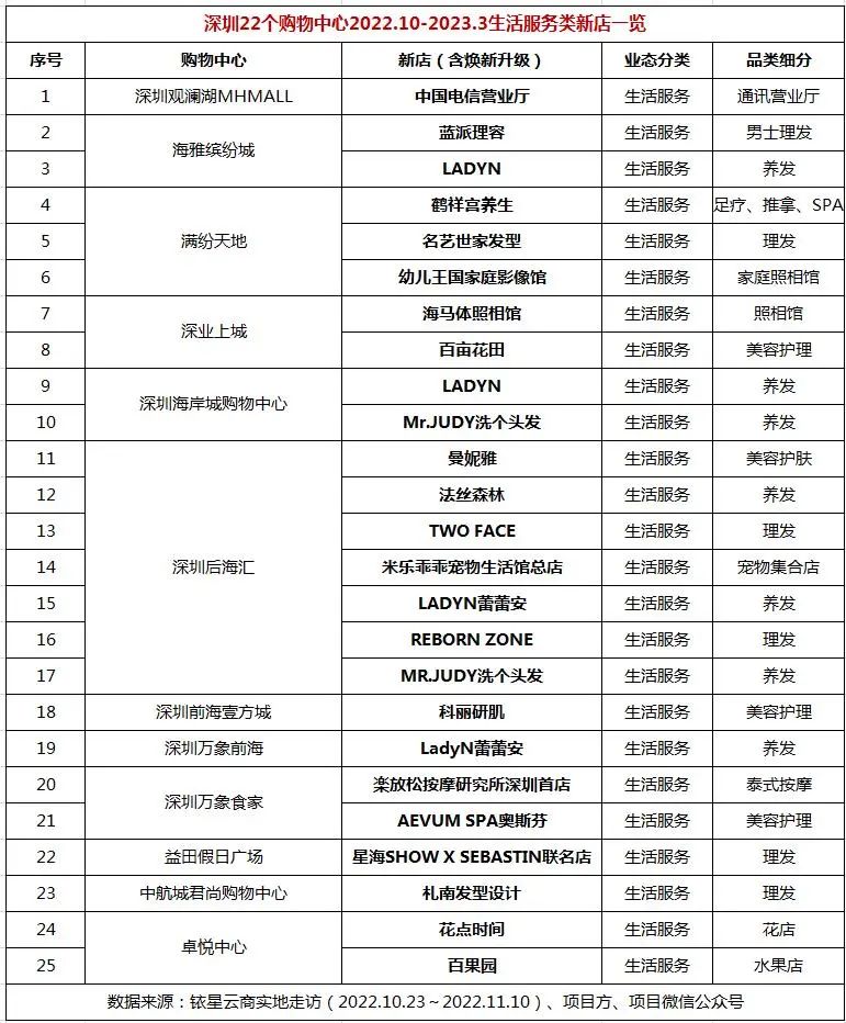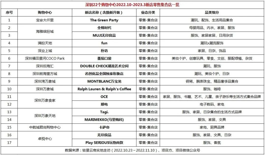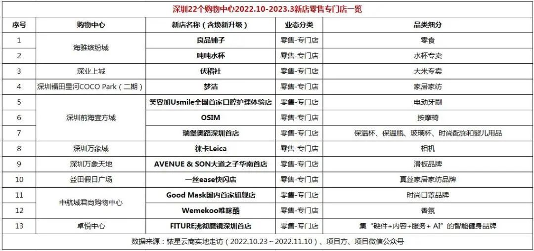 公众号后台回复“深圳新店”获取深圳22个购物中心品牌调改总表名单