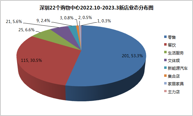 据铱星云商梳理,从数量上看,377家新店中,包括,零售业态一家独大,有201家,占比53.3%;餐饮位于第二名,有115个,占比30.5%;生活服务25个,占6.6%;文体娱占5.6%,有21个;新能源汽车9个,占2.4%;集合店3个,占0.8%;家居家具2个,占0.5%;主力店1个,占0.3%,为落户于深业上城的老佛爷百货华南首店。