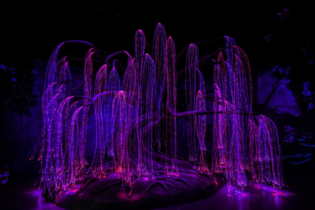 展览位于商场一楼中庭,约160平米。踏入其中,潘多拉星球经典的夜间奇景、高达3米的传声树、凶狠的毒狼、美丽的孔雀鹿等等熟悉的电影画面/生物走出荧幕照进现实。