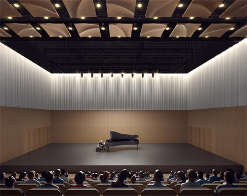 剧场整体面积约为1400平方米,配置有主剧场、排练厅等。剧场室内以木色、暖色调为主,打造温暖柔和的空间氛围。吊顶则是采用了木饰面穿孔铝塑板和54块木色UHPC弧形反声板,起到吸声作用的同时降低前厅的杂音,给观众进入剧场前带来自然柔和的舒适感。