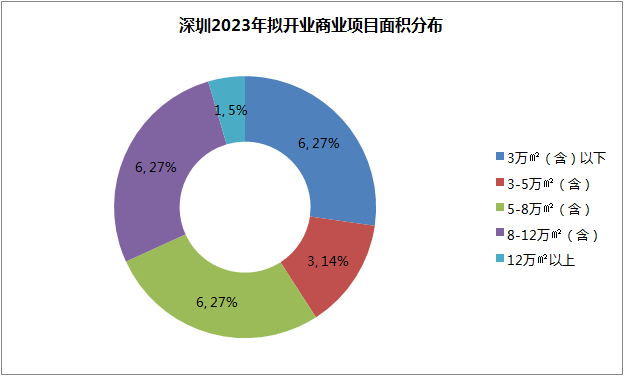 据铱星云商不完全统计,深圳2023年拟开业商业项目约22个,总商业建筑面积约153.3万㎡,平均单个项目商业体量约7万㎡。其中,3万㎡以下、5-8万㎡、8-12万㎡等三个区间的项目均包含6个,各占27%;3-5万㎡面积区间包含3个项目,占比14%;12万㎡以上仅有一个项目,即万丰海岸城购物中心。