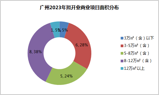据铱星云商不完全统计,广州2023年拟开业购物中心约21个,总商业建筑面积约178.7万㎡,平均单个项目商业体量约8.5万㎡。其中,3万㎡以下项目仅1个;3-5万㎡面积区间包含6个项目,占比28%;5-8万㎡有5个,占比24%;8-12万㎡区间项目最多,有8个,占比38%;12万㎡以上仅有一个项目,即广州佳创盛汇。