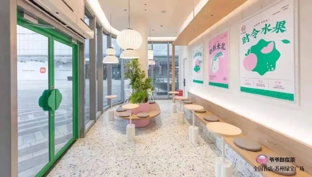 爷爷自在茶全国首店落地苏州绿宝广场,在店内装修上以粉、绿、白三色为主的装修配色,入口处的屏风设计,呼应着门店“江南新风尚”的定位,整体江南韵味十足。除了茶饮,门店还点心类和三款冰淇淋产品,包括蛋香原味厚蛋挞、小鲜肉酥饼和生椰瑞士卷三款产品,价格区间在6-14元。