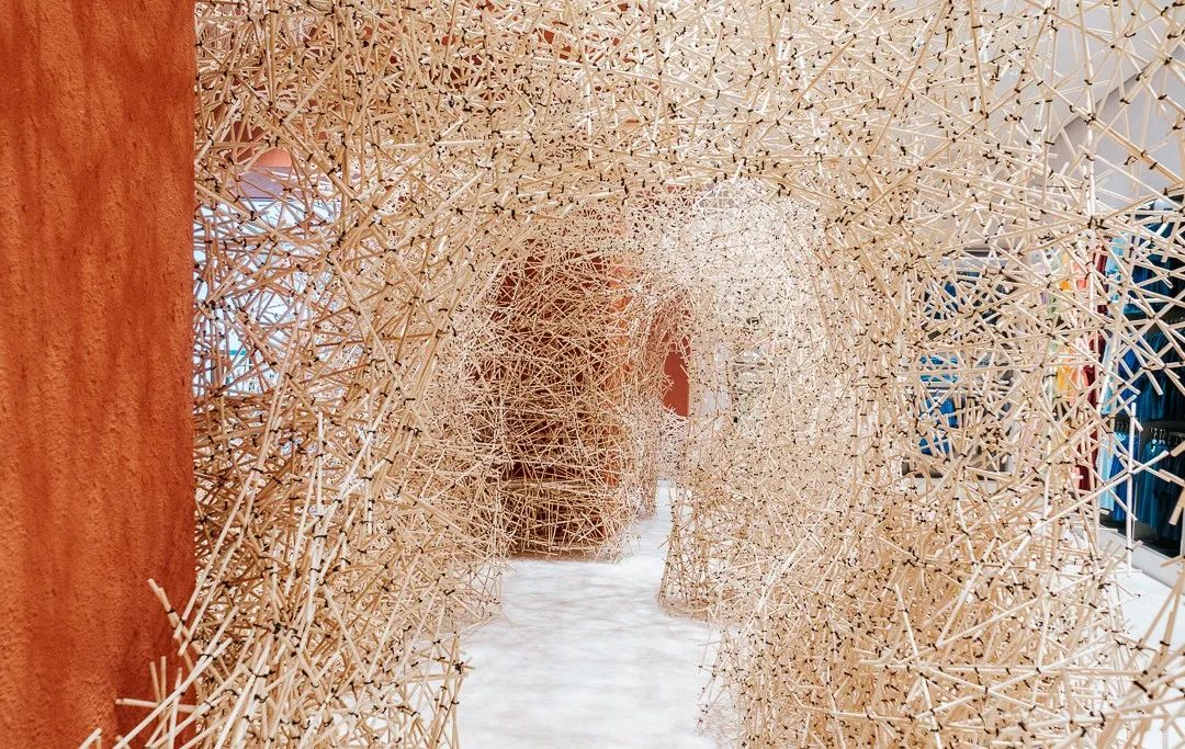 本来BENLAI国内首家线下实体店入驻广州万菱汇, 全国首店在三层空间打造纯色系、女装、男装和童装四个区域,店内以亮橙色为主色调,诠释出来基础不代表普通的概念,整个设计在传递艺术美陈的新观念,让消费者有购物体验的同时也有种看展的味道。店内还运用上万根木棍搭建起拱形洞穴,以及充满未来感的机械臂装置等,让单一的服装店变身更有趣的场所。