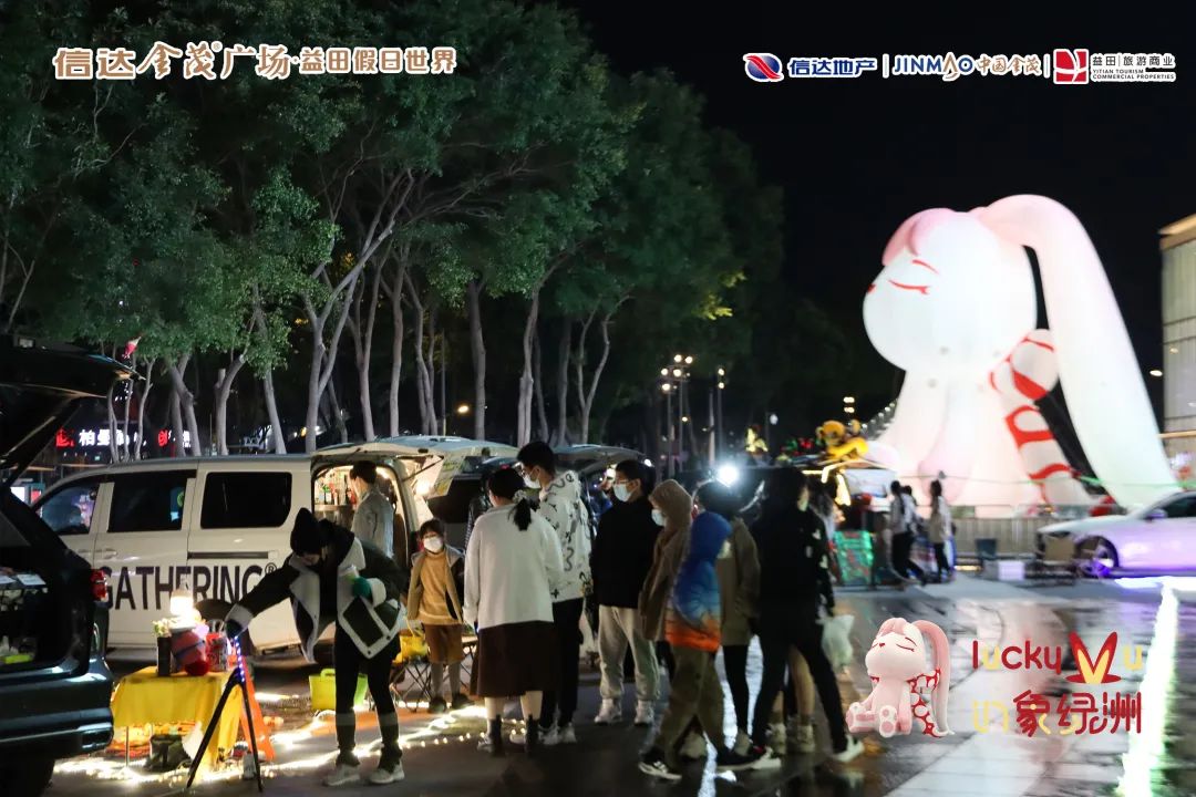 结合12-1月双12、圣诞、元旦营销节点,信达金茂广场·益田假日世界以美陈打卡+暖场活动为主线,引入冥想兔IP全国首展,开展暖冬市集、车尾箱市集、新年音乐会、小米之家开业庆典、天降红包雨、购物开盲盒等活动,元旦档客流明显回暖,客流较圣诞前日均提升约60%。