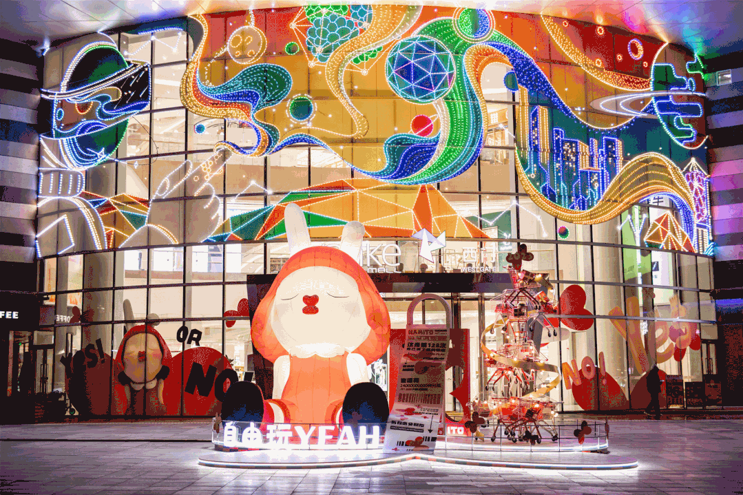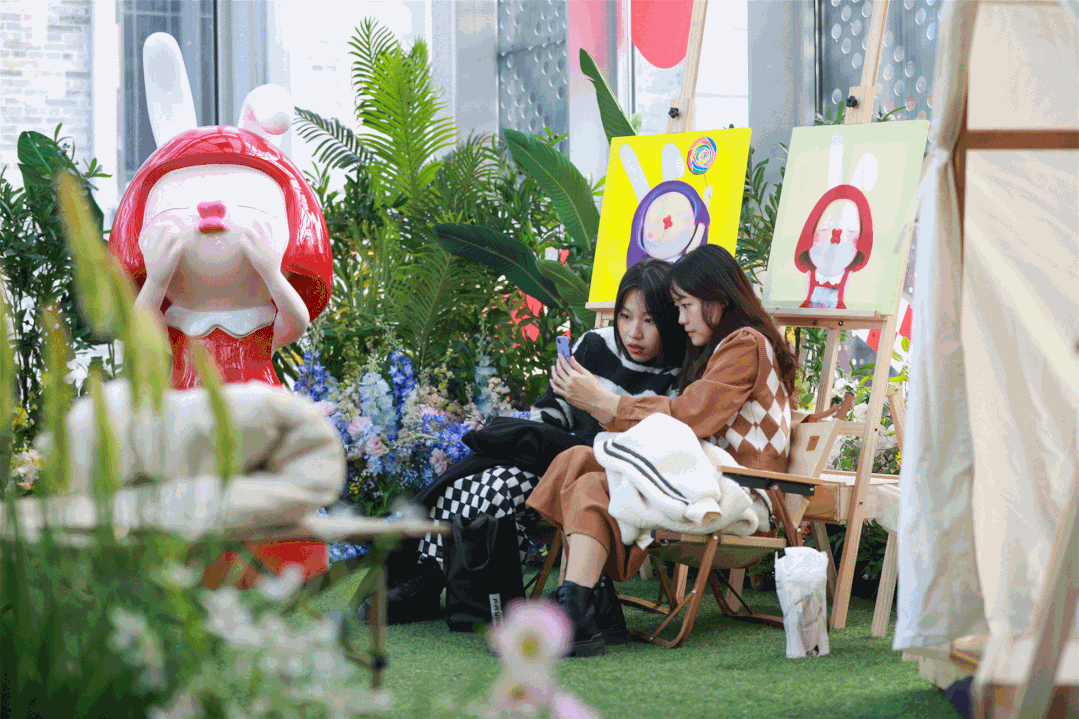 如在大湾区核心城市广州、东莞、佛山等城市的近20个项目联动落地艺术家张戈创作的“奈美兔”IP独家授权展,将现代潮流的表达方式与传统元素结合,营造具有年轻力氛围的兔年节庆场景。在独具广府风情的永庆坊,奈美兔还通过画展、美陈、布景等形式,于百年西关大屋里上演新年冒险历程,让现代艺术在与本土项目碰撞中激发新的魅力。