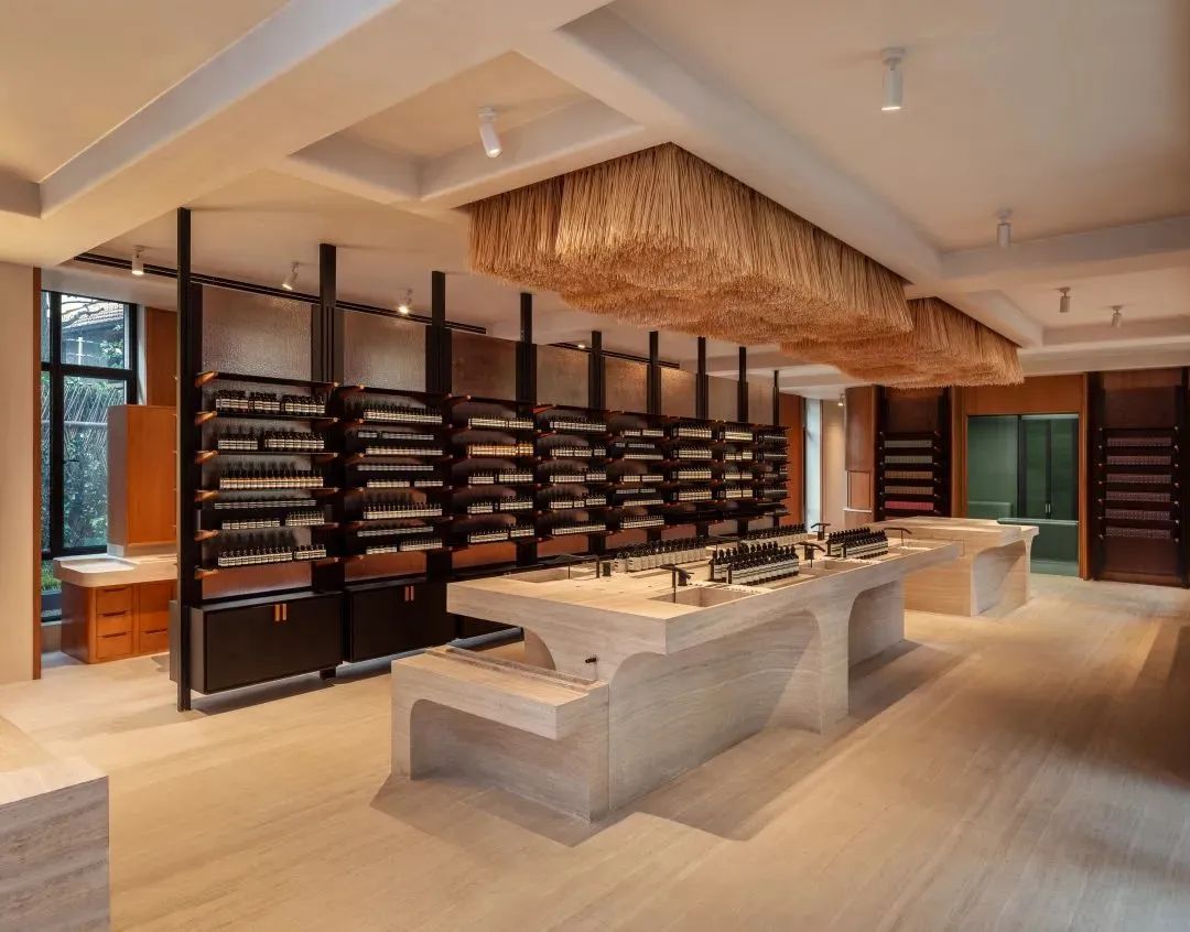 去年11月25日,Aesop伊索中国大陆首店于东平路上的两层红砖洋房中正式开业,主要出售洗护、护肤、精华、香氛四大系列产品。该门店整体空间设计将中式元素与Aesop美学相结合,还带有种植中草药植物的室外花园,彰显品牌自然高级的调性,与闹中取静的东平路气质互搭。
