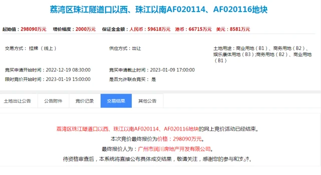 1月19日,华润置地广州公司以底价29.809亿元竞得广州市荔湾区珠江隧道口以西、珠江以南AF020114、AF020116地块,折合楼面价约1.2万元/平方米。相关消息显示,华润置地或将落地广州首个万象城项目。据了解,此次出让的地块位于白鹅潭商务区核心区,珠江隧道口以西、珠江以南,与广州著名景点沙面、白天鹅宾馆仅一江之隔,宗地面积3.49万平方米,计容建筑面积24.84万平方米。出让条件要求,竞得人自持商办物业不少于15万平方米,并引入高端购物中心品牌,集聚高端商贸产业上下游企业。