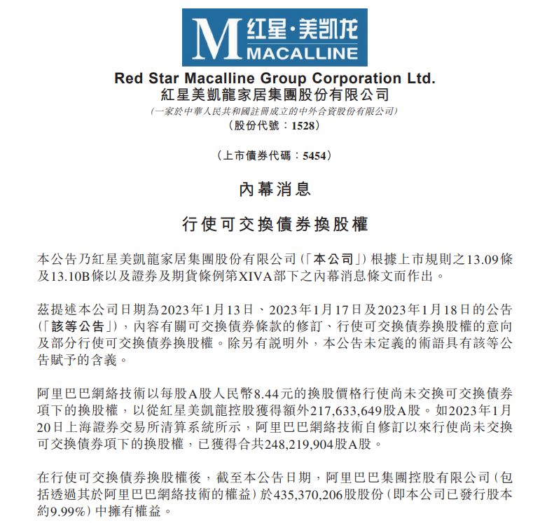 1月18日,阿里巴巴已以可交债换股的方式将其持有的部分本次可交债转换为红星美凯龙3058.63万股A股股份(占总股本的0.70%),本次权益变动后,阿里巴巴及其一致行动人合计持有红星美凯龙2.18亿股股份,约占上市公司总股本的5.00%。1月26日,红星美凯龙家居集团股份有限公司发布公告称,阿里巴巴网络技术以每股A股人民币8.44元的换股价格行使尚未交换可交换债券项下的换股权,以从红星美凯龙控股获得额外217,633,649股A股。在行使可交换债券换股权后,截至本公告日期,阿里巴巴集团控股有限公司(包括透过其于阿里巴巴网络技术的权益)于435,370,206股股份(即公司已发行股本约9.99%)中拥有权益。