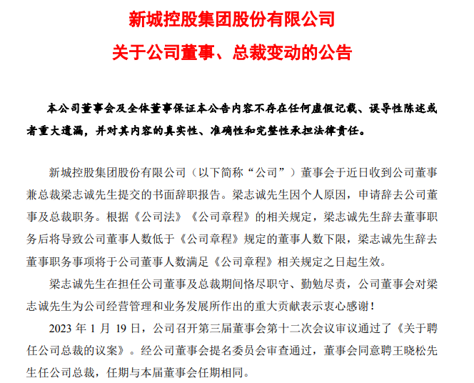 1月19日,新城控股发布关于公司董事、总裁变动的公告显示,梁志诚因个人原因,申请辞去公司董事及总裁职务。同时,公司召开第三届董事会第十二次会议审议通过了《关于聘任公司总裁的议案》。经公司董事会提名委员会审查通过,董事会同意聘王晓松任公司总裁,任期与本届董事会任期相同。