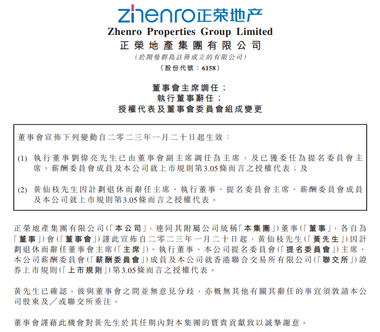 18.黄仙枝辞任正荣地产董事会主席,刘伟亮接任