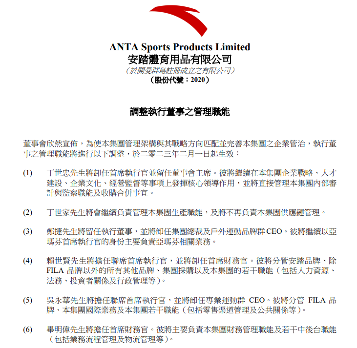 1月18日,安踏体育发布执行董事调整公告。自2023年2月1日起,(1)丁世忠将卸任首席执行官并留任董事会主席。此后,他将继续在企业战略、人才建设、企业文化、经营监督等事项上发挥核心领导作用,并将直接管理公司内部审计与监察职能及收购合并事宜。(2)丁世家将会继续负责管理公司生产职能,不再负责供应链管理。(3)郑捷将留任执行董事,并卸任总裁及户外运动品牌群CEO,他将继续以亚玛芬首席执行官的身份,主要负责亚玛芬相关业务。(4)赖世贤将担任联席首席执行官,并将卸任首席财务官。他将分管安踏品牌、除 FILA 品牌以外的所有其他品牌、集团采购以及集团的若干职能(包括人力资源、 法务、投资者关系及行政管理等)。(5) 吴永华将担任联席首席执行官,并将卸任专业运动群 CEO。他将分管 FILA 品牌、集团国际业务及集团若干职能(包括零售渠道管理及公共关系等)。(6) 毕明伟将担任首席财务官。他将主要负责本集团财务管理职能及若干中后台职能 (包括业务流程管理及物流管理等)。