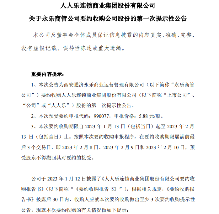 1月19日,人人乐连锁商业集团股份有限公司发布关于永乐商管公司要约收购公司股份的第一次提示性公告。据了解,本次要约收购价格为5.88元/股,要约收购的股份为除西安曲江文化产业投资(集团)有限公司、浩明集团、人人乐咨询公司、何金明、张政以外的其他全部已上市无限售流通股的全面要约(要约收购数量107,282,034股,占上市公司已发行股份的比例24.38%)。本次要约收购期限自2023年1月13日(包括当日)起至2023年2月13日(包括当日)止。按照本次要约收购申报程序,在要约收购期限届满前最后3个交易日,即2023年2月8日、2023年2月9日和2023年2月10日,预受股东不得撤回其对要约的接受。