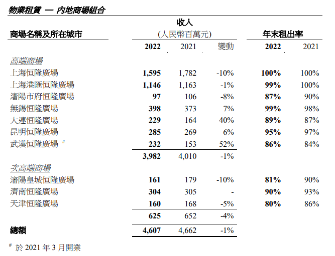其中,内地包括商场、办公楼和酒店的整体租赁收入为72.18亿港元(折合人民币为61.9亿元),收入和营业溢利按人民币计值上升 1%,按港币计值则分别下跌 2%和 3%。仅从内地商场业绩来看,内地商场2022年总体收入为人民币46.07亿元,较2021年下跌 1%。高端和次高端商场收入分别下跌1%和 4%。其中上海恒隆广场全年收入为人民币15.95亿元,按年下跌10%,而租户销售额下跌24%;上海港汇恒隆广场全年收入为人民币11.46亿元,按年下降1%,租户销售额按年下降19%。
