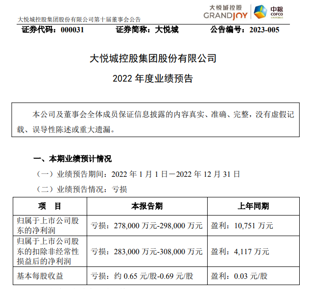 1月30日,大悦城控股集团股份有限公司发布2022年度业绩预告显示,报告期内归属于上市公司股东的净利润预计亏损27.8亿元到29.8亿元,扣除非经常性损益后的净利润预计亏损28.3亿元到30.8亿元。大悦城表示,报告期净利润为负值的原因是期内销售型业务结算规模减少,毛利率下降;为扶持租户平稳经营和发展,公司对合作商户累计减免租金约10亿元。此外,为加快库存去化和资产周转,部分在建在售项目销售价格未达预期,同时对联合营企业的投资亏损也同比增加。