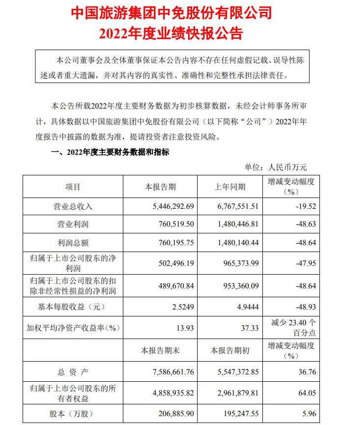 2月3日,中国旅游集团中免股份有限公司发布2022年业绩快报公告。2022年,公司实现营业总收入 544.63亿元,同比下降19.52%;实现营业利润76.05亿元,同比下降48.63%;实现归属于上市公司股东的净利润50.25亿元,同比下降47.95%。中国中免认为,营业利润及净利润大幅下降原因为疫情冲击和上年同期基数偏高。
