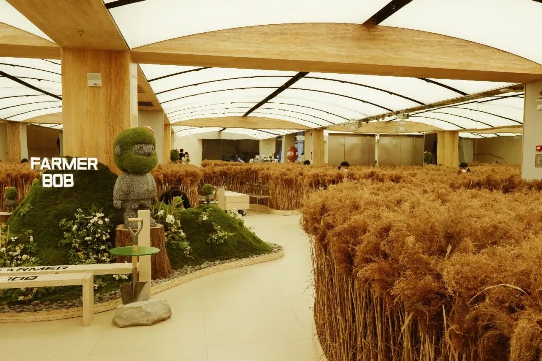 以去年底亮相上海淮海中路的FARMER BOB全球首家旗舰店为例,门店以“麦田新生”为主题,借岩石、麦浪、云团等元素连接不同的场域,增加视觉冲击感。一楼必打卡的绝美“麦田”,被一片片金色麦浪包围,二楼大片草垛中FARMER BOB装扮成稻草人,带来打卡惊喜,整个空间涵盖潮玩、咖啡、潮流配饰、运动家居等IP产品。