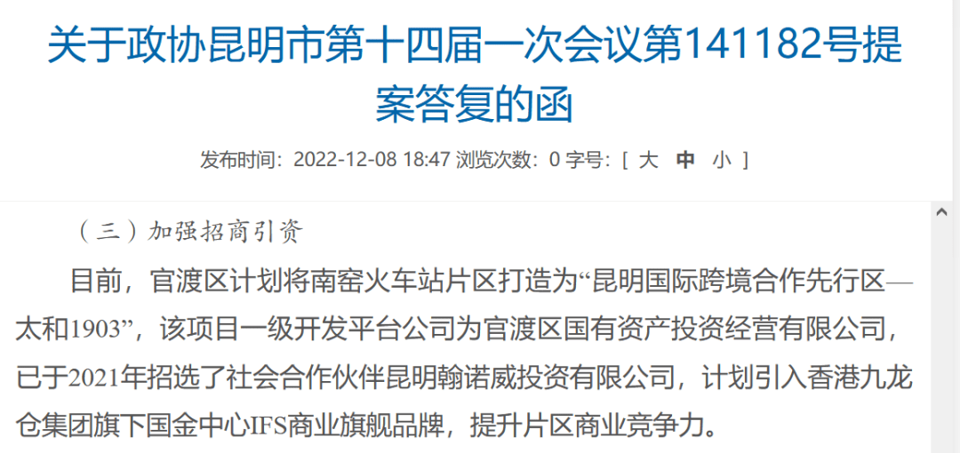 近期,昆明市住建局就《关于高品质推进南窑火车站片区城市更新改造的建议》提案的答复显示,官渡区计划将南窑火车站片区打造为“昆明国际跨境合作先行区—太和1903”,该项目一级开发平台公司为官渡区国有资产投资经营有限公司,已于2021年招选了社会合作伙伴昆明翰诺威投资有限公司,计划引入香港九龙仓集团旗下国金中心IFS商业旗舰品牌,提升片区商业竞争力。