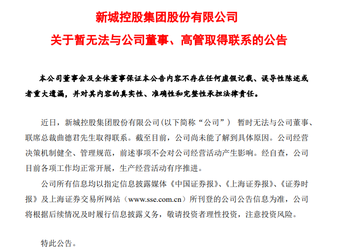 2月10日晚间,新城控股集团股份有限公司发布公告表示,暂无法与公司董事、高管曲德君取得联系。截至目前,该公司尚未能了解到具体原因。公告亦表示,公司经营决策机制健全、管理规范,前述事项不会对公司经营活动产生影响。经自查,公司目前各项工作均正常开展,生产经营活动有序推进。