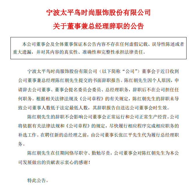 2月7日,太平鸟发布公告,公司董事会于近日收到公司董事兼总经理陈红朝提交的书面辞职报告。陈红朝因个人原因,申请辞去公司董事、董事会提名委员会委员、总经理职务,辞职后不在公司担任任何职务。公告显示,在聘任新的总经理之前,由公司董事长张江平代为履行总经理职务。