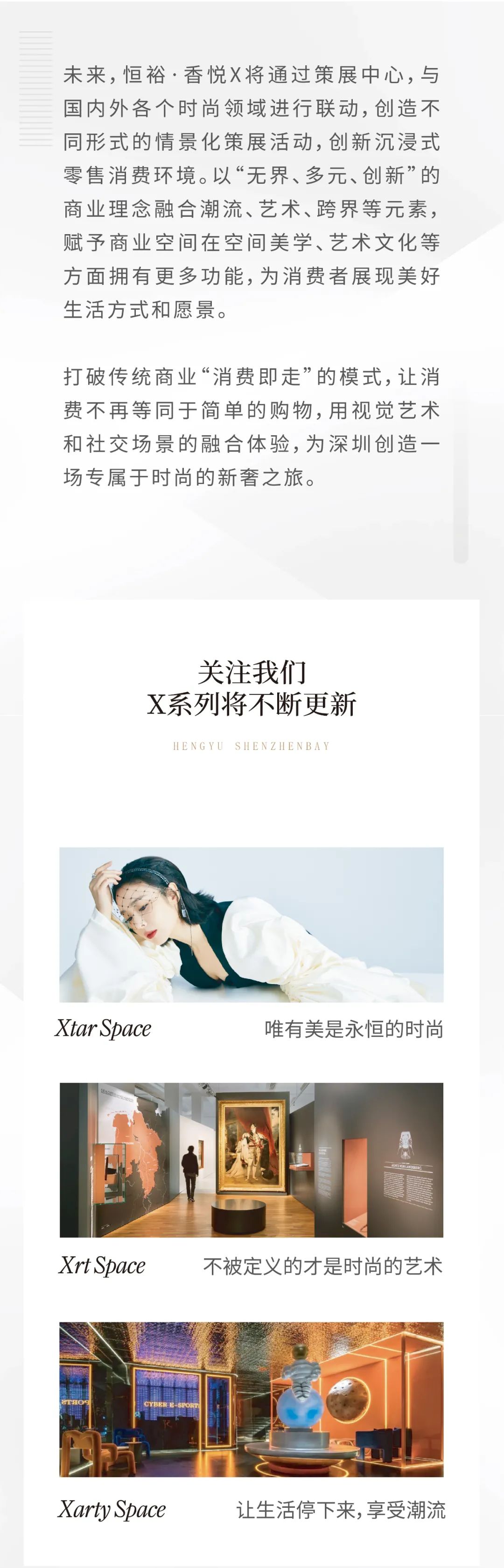 恒裕·香悦X于“新奢,未来式商业”的探索中,呈现全球潮尚BOX、至臻食刻 LAB、沉浸社交 ROOM、跨界锋范LANDMARK和新奢风尚BAZAAR 五大主题业态,未来将不断更新时尚封面人物、艺术策展、潮流活动等场景体验。