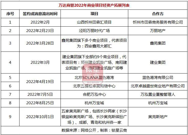 截至2022年6月30日,万达管理的425座商业广场中,140个由独立第三方拥有,占在管商业广场总数的32.9%。仅从2022年来看,万达全年在全国各地拿下超20个轻资产项目。