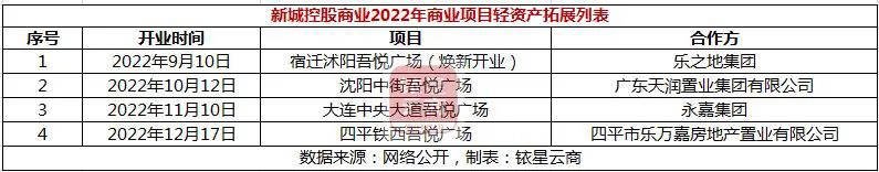 资料显示,新城控股在2016年开始尝试轻资产运营,截至2023年1月25日,新城控股集团在全国已开业及委托管理在营项目达到145座,其中,轻资产吾悦广场超32座。据不完全统计,2022年新城控股商业轻资产开业或签约项目有4个。