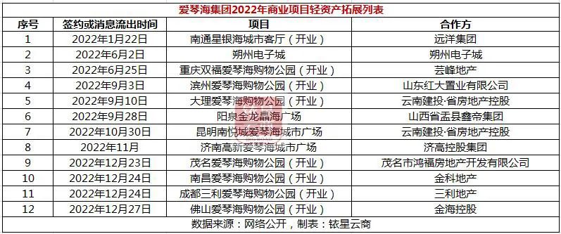 2022年12月下旬,爱琴海集团三天开出位于茂名、南昌、成都和佛山的4座爱琴海购物公园,均为轻资产输出项目……
