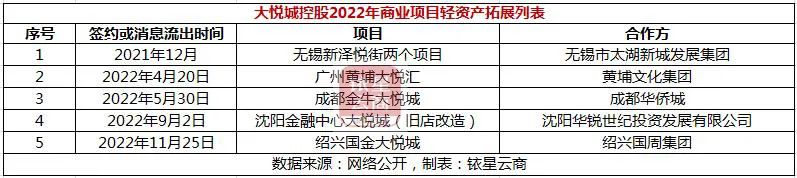 近些年,大悦城控股商业持续以轻资产项目拓展为重要战略方向。日前,大悦城控股商业宣布,无锡江南大悦城、北京京西大悦城、成都天府大悦城、沈阳金融中心大悦城、广州黄埔大悦汇、天津西青大悦汇共计六个项目预计将在今年亮相。资料显示,其中超半数为轻资产项目。据铱星云商不完全统计,大悦城于2022年获取数个轻资产商业项目,分别位于广州、成都、无锡、沈阳等城市。2021年签约的绍兴国金大悦城也已开业。