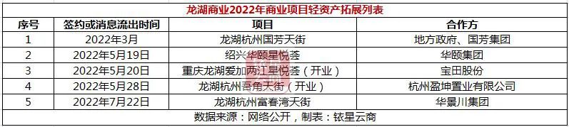 据龙湖官微信息,龙湖商业于2021年初启动轻资产战略,截至目前,已累计获取近30个轻资产项目,2023年,龙湖商业将有北京北苑天街、上海江湾里MEET678、杭州国芳天街、石家庄裕华星悦荟、武汉M785 及汕头国厦星悦荟等6个轻资产项目开业。据铱星云商不完全统计,龙湖2022年获取或开业的轻资产项目有5个。