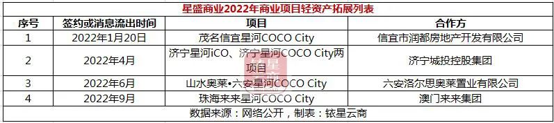作为纯商业运营服务第一股的星盛商业,2022年获取5个轻资产项目,分别为:茂名信宜星河COCO City、济宁星河COCO City、济宁星河iCO、山水奥莱·六安星河COCO City、珠海来来星河COCO City。