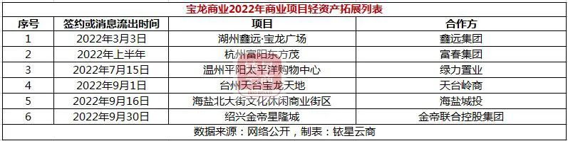 据宝龙商业2022年中报数据显示,2022年上半年,宝龙商业外拓富阳东方茂、临安IN巷、杭州湘湖慢生活街、济源宝龙广场等4个项目,其中临安IN巷和杭州湘湖慢生活街提供咨询顾问服务。据铱星云商不完全统计,作为知名商业运营服务提供商,宝龙商业在2022年开业或签约的项目超6个。