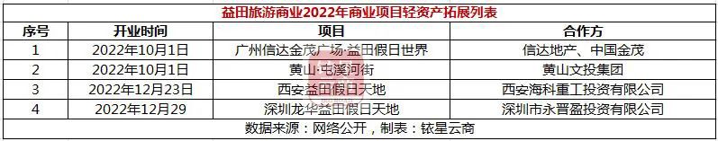 以“文化旅游+体验商业”为商业模式持续深耕商业地产,益田旅游商业集团在2022年开业了4个轻资产项目。