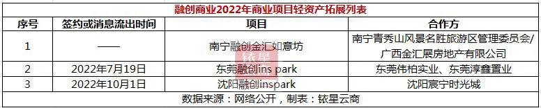 截至2022年末,融创商业已在广州、重庆、成都、合肥、无锡、青岛等22个城市布局了35个商业项目,建筑面积约413万㎡。在2022年,融创商业新增南宁融创金汇如意坊、东莞融创ins park、沈阳融创ins park等轻资产项目。2023年,融创商业还将带来淮安融创ins park(2023.1.12已开业)、南宁路桥融创茂、六安融创ins park等项目的亮相。