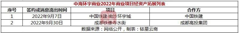 2022年9月7日,中海商业与中国铁建就轻资产商业管理服务达成合作,中海环宇城系列品牌进驻广州南沙核心区海语熙岸购物中心项目,即中国铁建·南沙环宇城。项目总体量15万平米,商业面积10万平米,计划2023年开业。