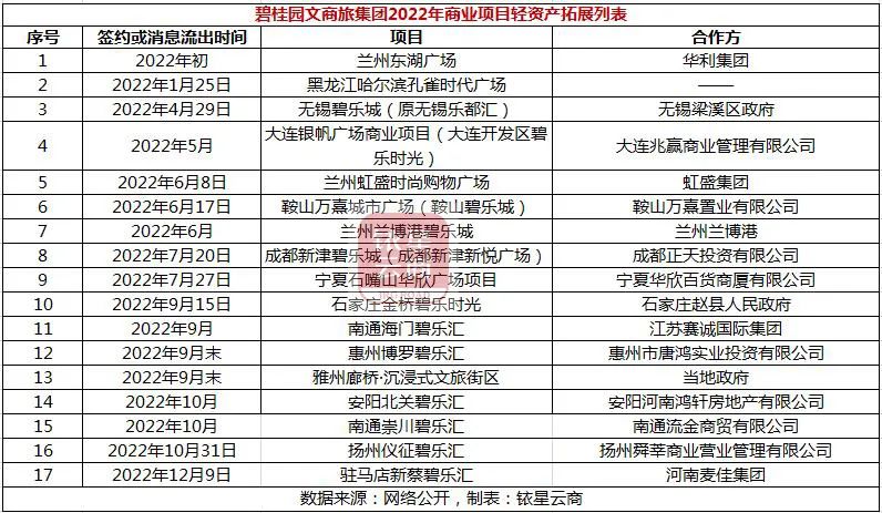 作为商业管理轻资产“新兵”,自2021年底集团加速发展轻资产业务起,碧桂园商业轻资产发展迅猛,资料显示,2022年碧桂园文商旅集团签约拓展项目达30余个。