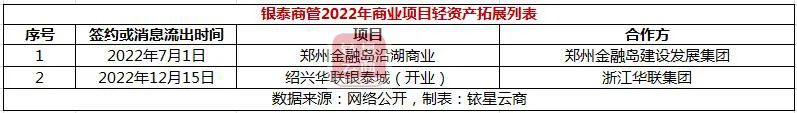 资料显示,除了最新与新湖集团合作拓展的瑞安新湖银泰城,银泰商业管理集团在2022年签约或开业2座轻资产项目。