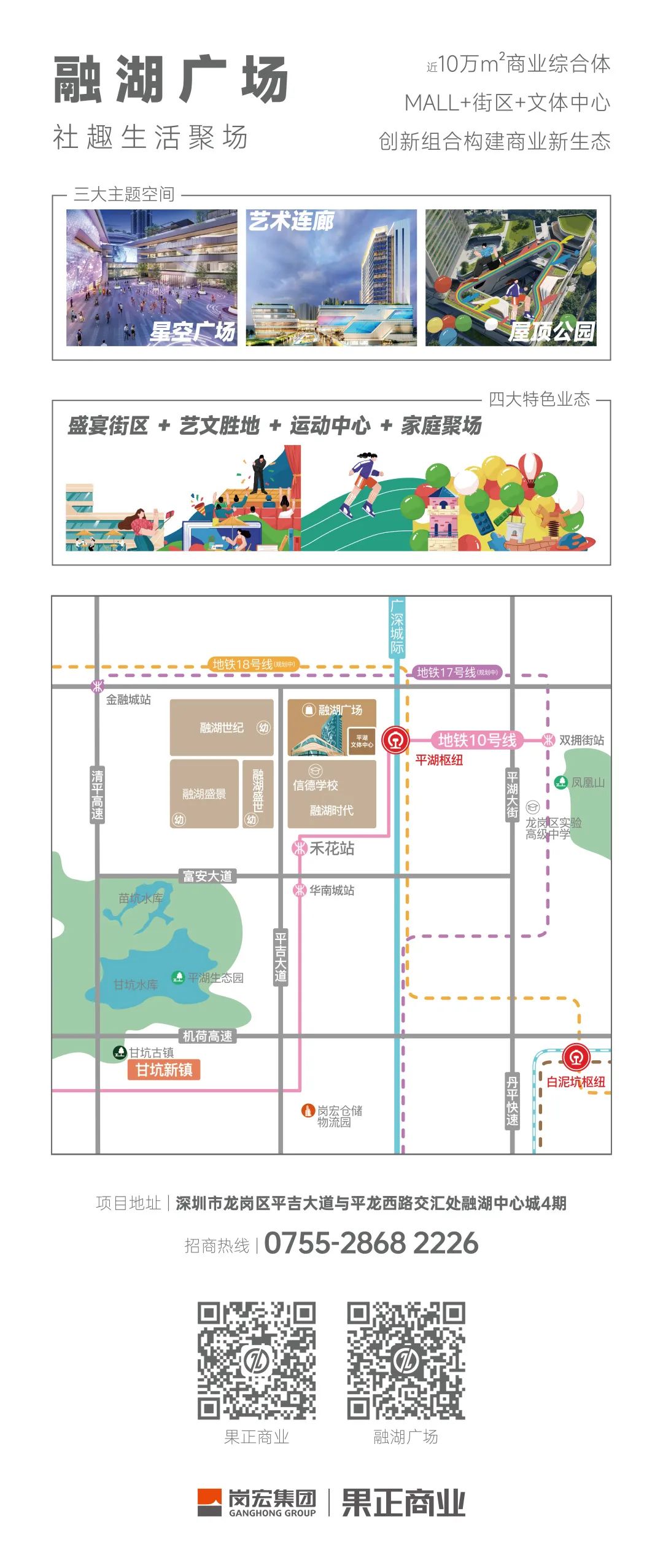 如今的平湖,已率先开启深圳4.0枢纽时代,正蓄势成为深圳的又一个超级城市中心。显然,巨变之中的平湖,路网体系建设仍在不断完善。展望未来,平湖的交通发展将实现“蝶变”,对内循环通畅,对外联系紧密,出行环境将在很大程度上得到改善和提升。政策利好持续释放,为平湖地区孕育无限商机,同时也将为融湖广场焕发强劲的消费活力,加之融湖广场自身的精准定位及业态规划,一副崭新的发展蓝图呈现在眼前。期待未来与您携梦同行!