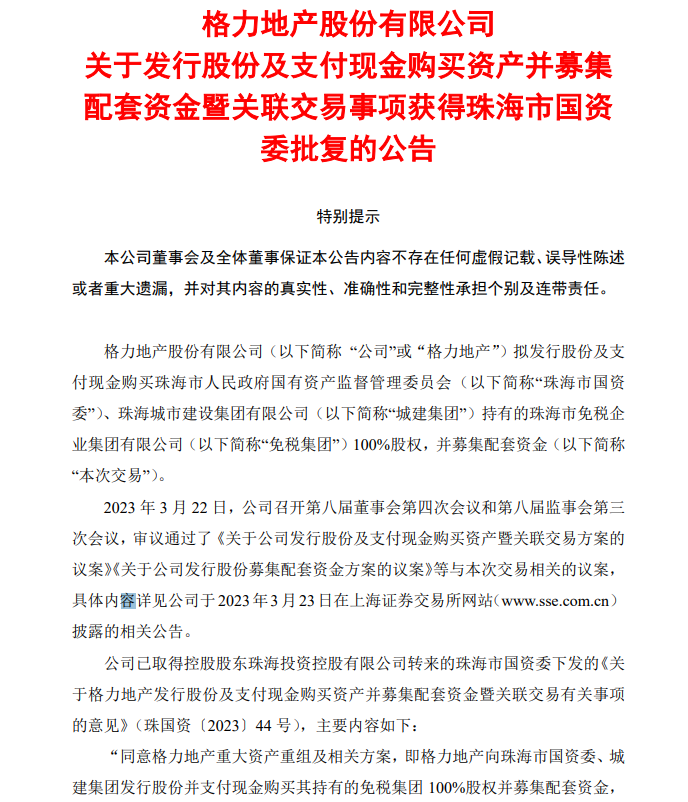 4月4日,格力地产公告,公司已取得控股股东珠海投资控股有限公司转来的珠海市国资委下发的《关于格力地产发行股份及支付现金购买资产并募集配套资金暨关联交易有关事项的意见》。国资委同意公司重大资产重组及相关方案,即公司向珠海市国资委、城建集团发行股份并支付现金购买其持有的免税集团100%股权并募集配套资金,募集配套资金总额不超过70亿元。