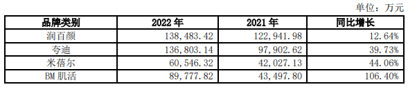 华熙生物发布2022年财报显示,公司去年营收增长28.53%至63.59亿元,归属净利提高24.11%至9.71亿元。2022 年,公司功能性护肤品实现收入 46.07 亿元,同比增长 38.80%,占公司主营业务收入的 72.45%,毛利率为 78.37%,继润百颜品牌之后,夸迪成为第二个收入超过10亿元的品牌,同时,BM肌活去年实现收入8.98亿元,有望成为第三个收入迈入10亿元门槛的品牌。